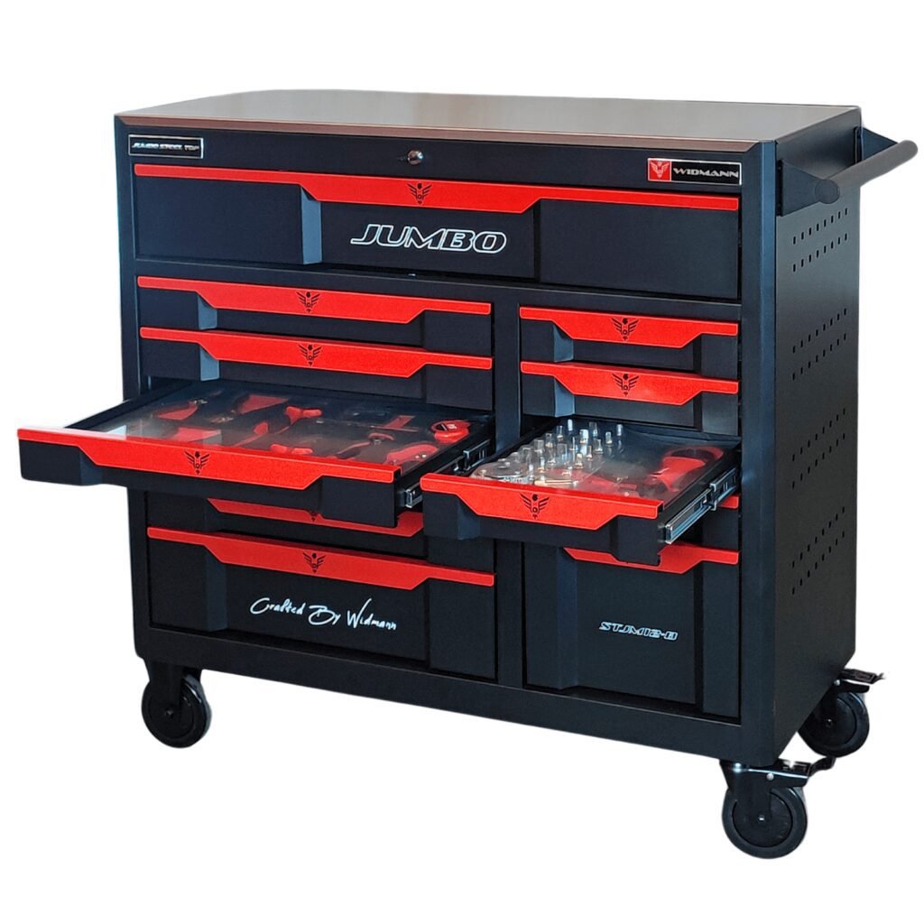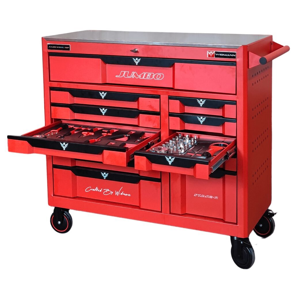 Discover the new WIDMANN JUMBO STEEL TOP 12 with 274 pcs This movable 12-drawer workshop tool trolley for professional mechanics.