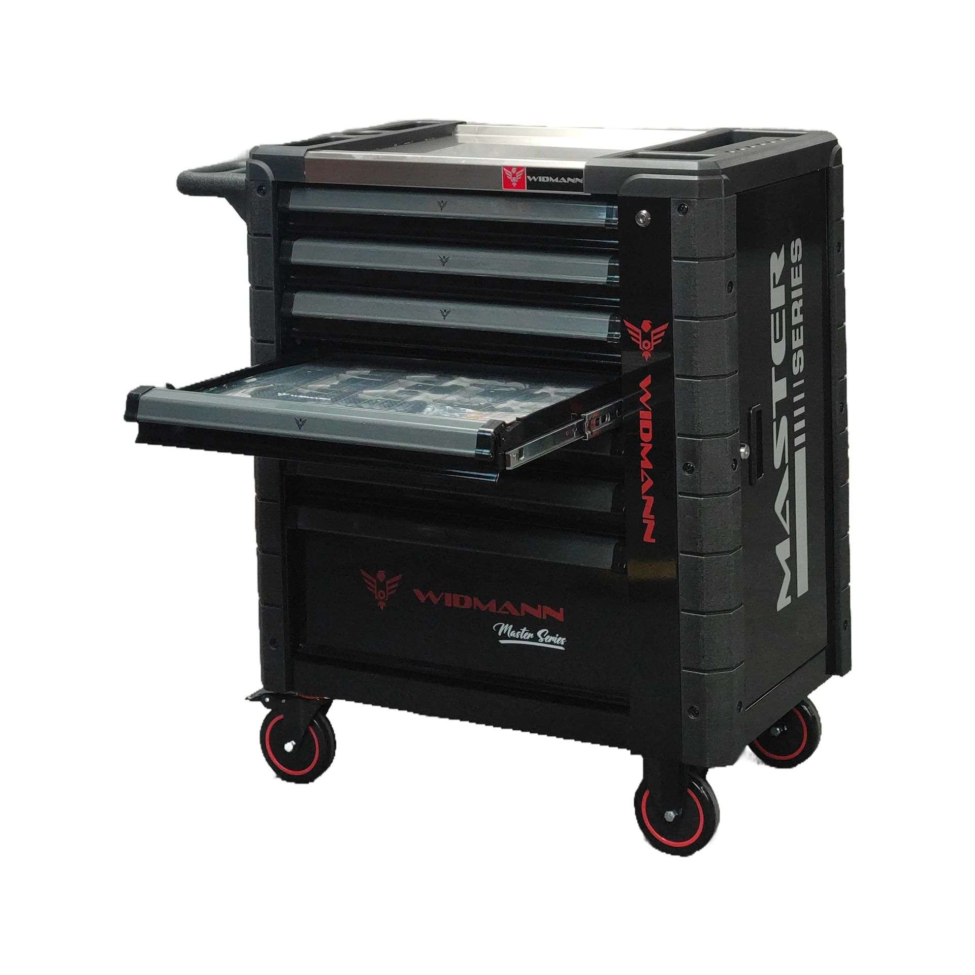 This version of 7 drawer tool chest from Widmann comes with a wide range of high quality tools (wrench sockets, spanners, screwdrivers, pliers and much more). No matter whether for your hobby room, workshop or garage, this tool cabinet is a perfect solution. Thanks to the integrated lock, 7 drawers can be locked at once which prevents the drawers from opening accidentally when the chest is being moved. The robust countertop on the tool trolley will be a great spot to keep frequently used tools within reach. Double paneled walls, body reinforcement and ball-bearing drawer slides for smooth action.